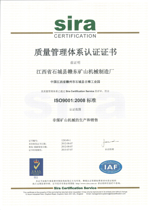 本廠通過歷時5個月的管理咨詢培訓(xùn),于2012年08月07日正式通過ISO9001:2008國際質(zhì)量管理體系認(rèn)證,在我縣礦山機械行業(yè)中又一次走在前列。本廠將嚴(yán)格按照ISO9001:2008國際質(zhì)量管理體系各要求執(zhí)行,力爭將企業(yè)產(chǎn)品從質(zhì)量、科技含量等方面又上一個新臺階。